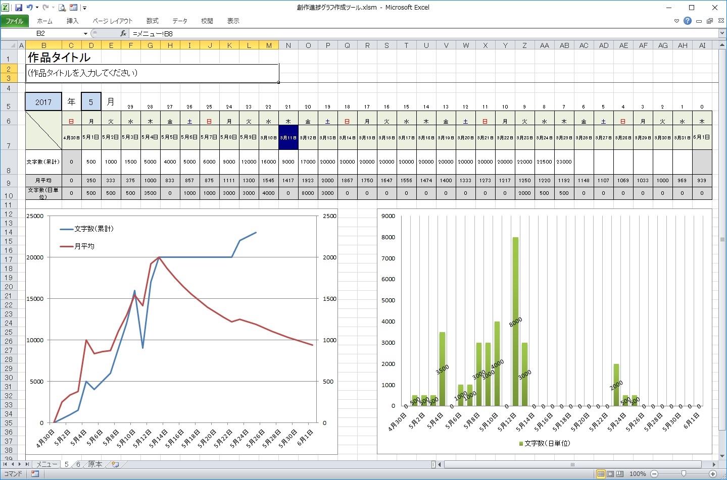 書いた文字数を毎日記録を取ってグラフ化してみるということを明日から実践しようと思う。と、とある方が仰られていて、面白そうな試みだなと思ったので、エクセルで簡単にツール(もどき)を作成してみた。