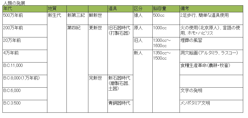 以前まとめた、人類勃興期の流れは以下の表。