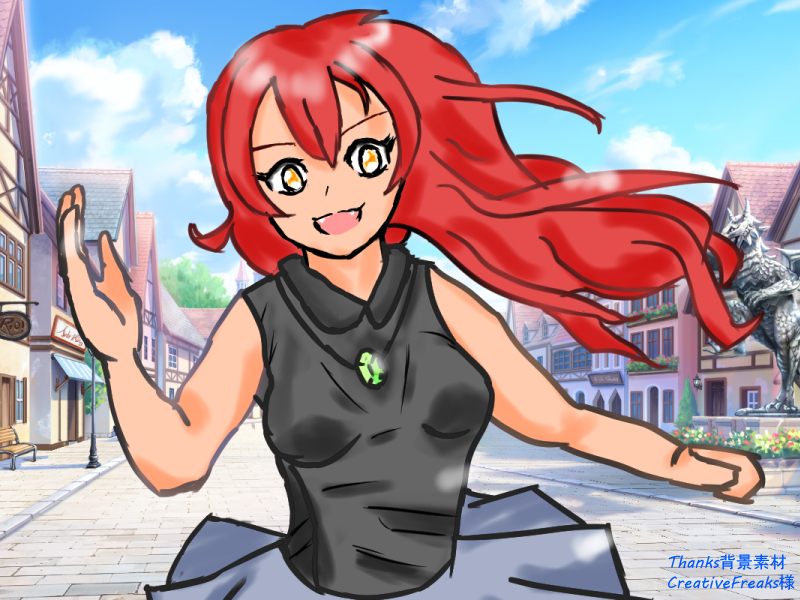 とりあえず、昨日までに描いていたイラストを一枚アップする。一応模写、だが、途中で似せる気がなくなってくる。次の作品は、何とかできるだけ似せられるようにしたい、が……。ともかく今回は、背景素材を拝借して合わせてみた。
