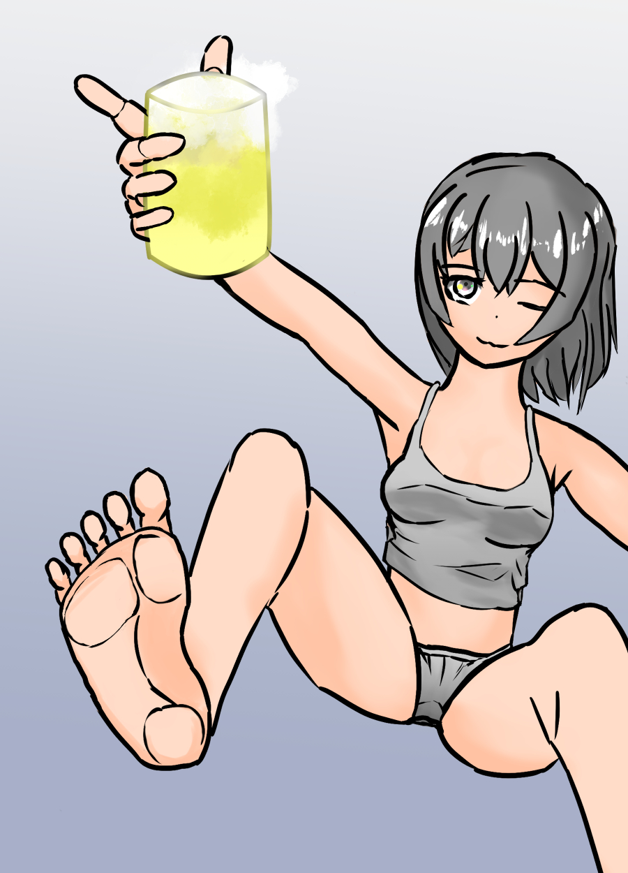 構図を工夫。あと指と、足の裏をがんばって描いてみた。足の裏の参考画像がなかなか見つからなかった。難しい。あと、ビールっぽいのを表現。飲み物の参考画像は比較的豊富だったが、表現が難しい。