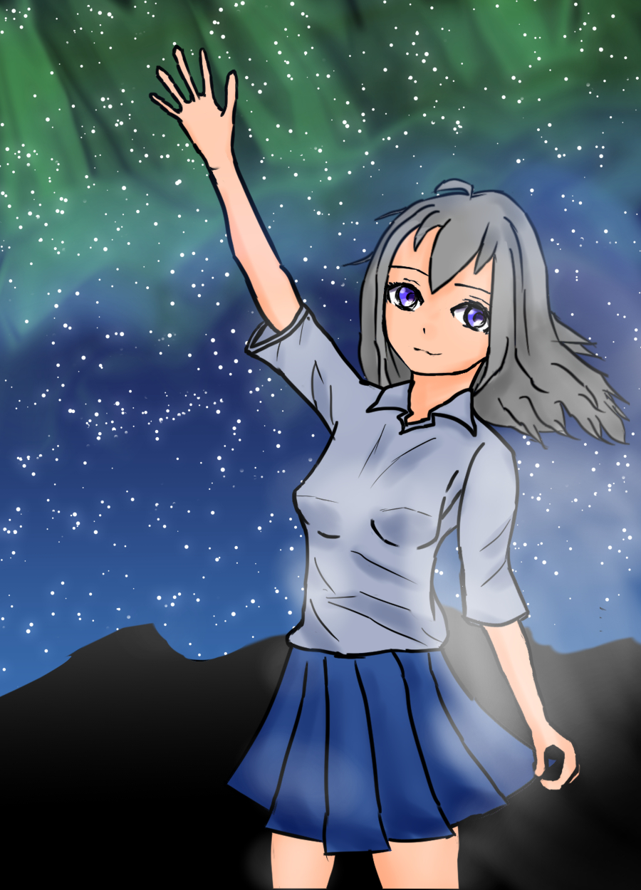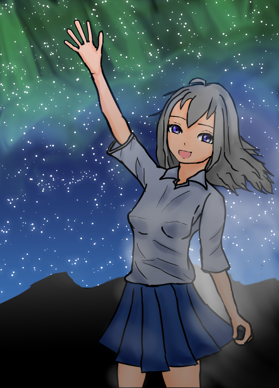 まぁ、今回のテーマというか目標は、どっちかというと背景。夜空と星とオーロラを描いてみたかった。