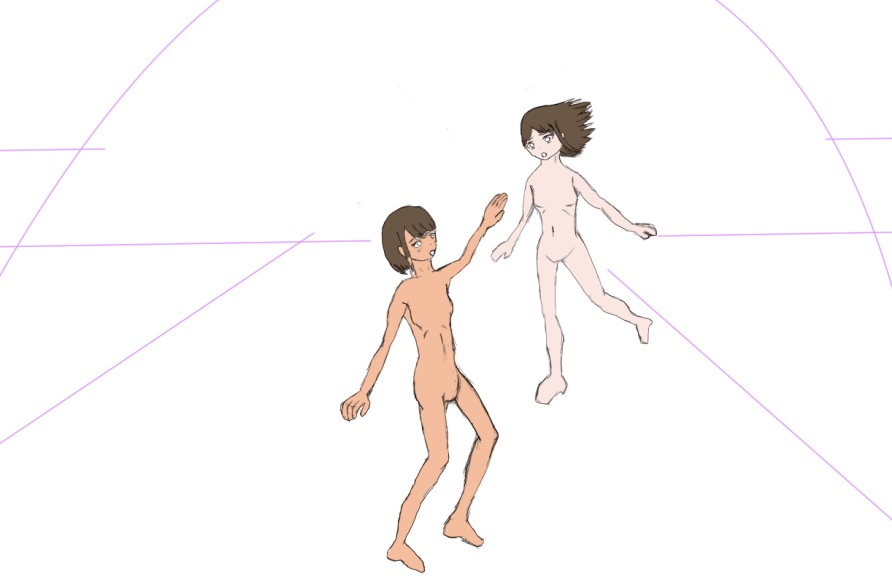 初めて、後姿を書いてみる。思ったことは、後ろ姿はまた、全然別の絵だということである。3Dモデルだと、ぐるぐるまわせば終わり的な感じだが、絵だと、気を付けるポイントが全然違う気がする。使いまわせる知識としては、全身の構成比……等身、手の先は太もものあたりまで、とか、それぐらい。