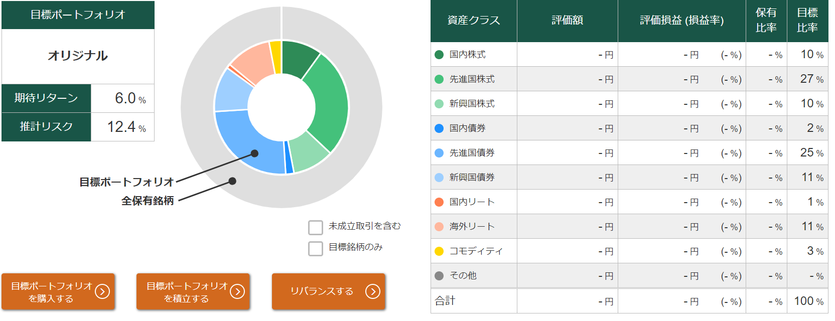 ところが、証券会社の投資信託の画面に飛ぶと、どうやら、ポートフォリオを決めると――要するに、国内株式は何%、新興国債券は何%と、数字を選ぶだけで、適切な銘柄を自動的に選んでくれるみたいである。ここはもしかして拘るポイントなのかもしれないと思いつつ、「面倒くさかった」ので、何%を決めるだけで購入に踏み切ろうという気持ちになった。