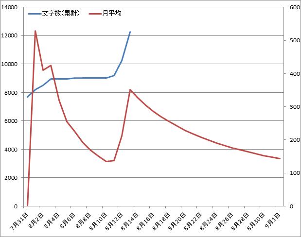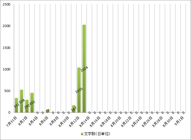 ルーチンが早速とん挫したようなグラフになっているが、他の連載中の作品を書き進めているので、ゼロではない。どうも、気が散りやすいのか、一つの作品だけ集中して手掛けるというのは、あまり効率的ではない気がする(精神的に)。でも、「書くなら、締め切りをもうけなければ絶対ダメ」とかいう先人たちのお言葉も見聞きする。そりゃそうなんだけど、気分が乗らないときにWORD開いても、何分立っても真っ白、ってこともあるのだから、それよりかは、複数作品をもぐらたたき的に少しずつ進めていくのも悪くない気がする……とか言えるのは、ある程度完成品を量産させてからだな。