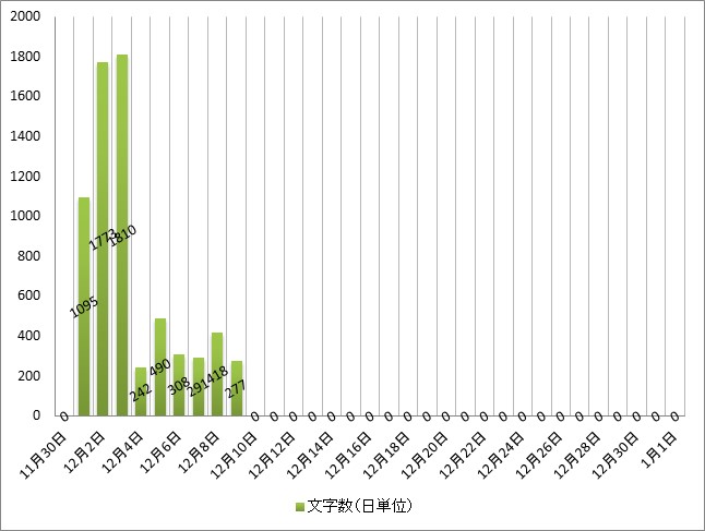 グラフは以下。昨日は日曜日だったが、思うように進められなかった。溜まってカオスゾーンと化した部屋の片づけや、備品買い出しなどの庶務に追われたというのもある。昼までやはり寝てしまう現象が勃発するというのもある。――言い訳のようでいて、言い訳なのであるが、その、原因の分析作業でもある。無駄ではないと信じたい。