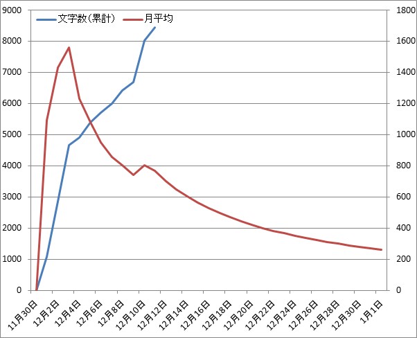 つまり、今日時点だと、約800字の座標になっているから、明日は800字を超えなければ、平均は下がる一方になるということだ。
